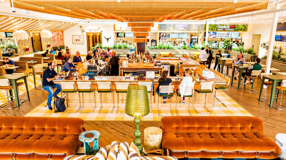 Evening view of a road at The Forum Plaza with festive tree lighting, cars driving, and a valet person in front of the Versona store.